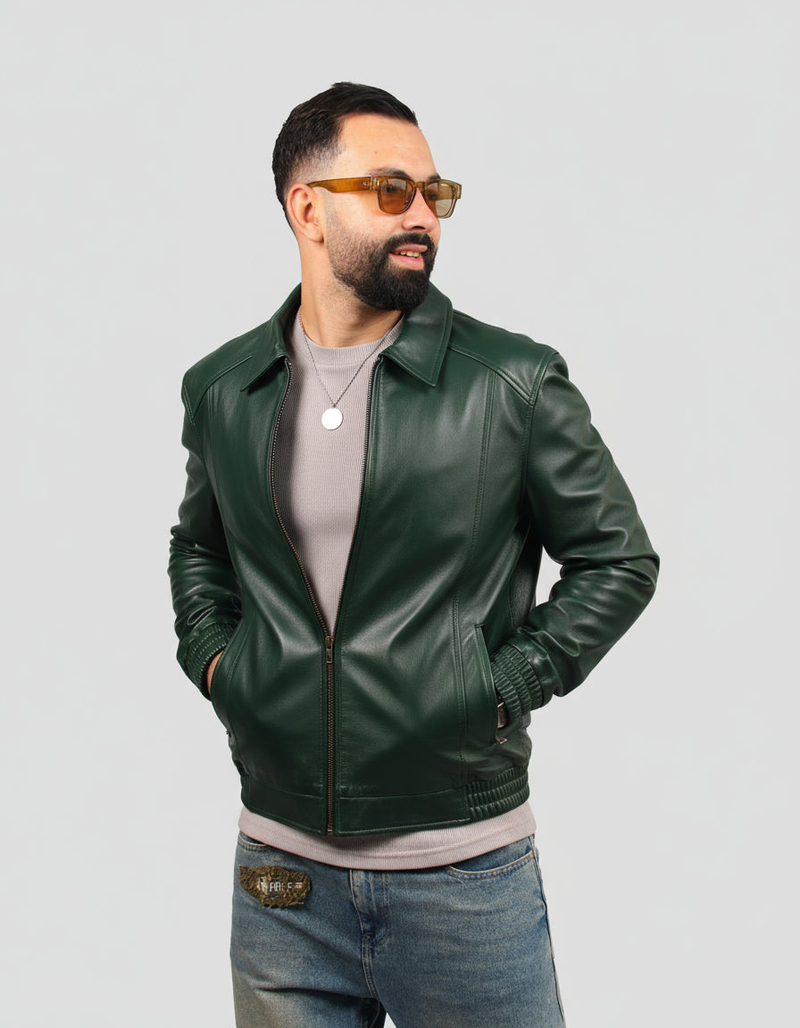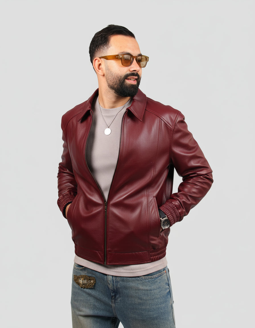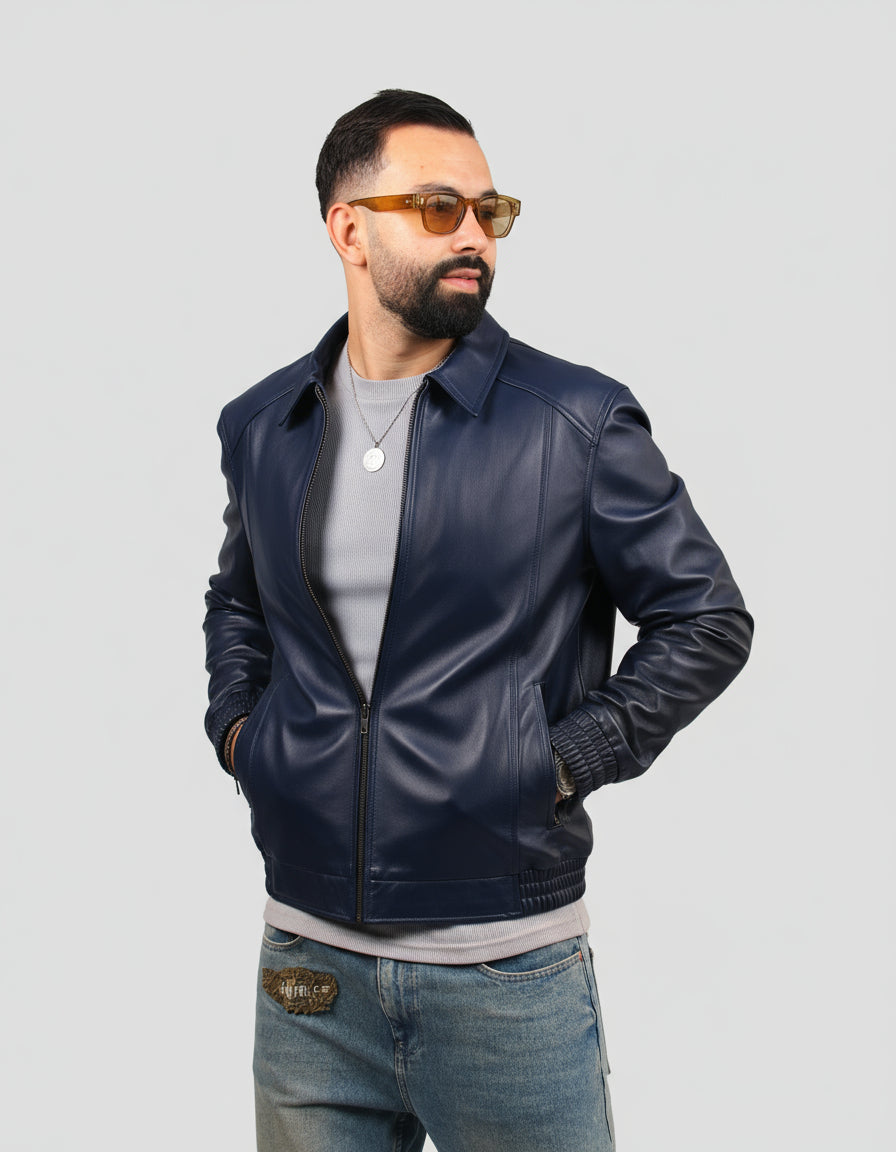 Blouson en cuir véritable au toucher doux et finition lisse. Col chemise, fermeture zippée et poches latérales. Détails élastiqués à la taille et aux poignets pour un style moderne et décontracté.