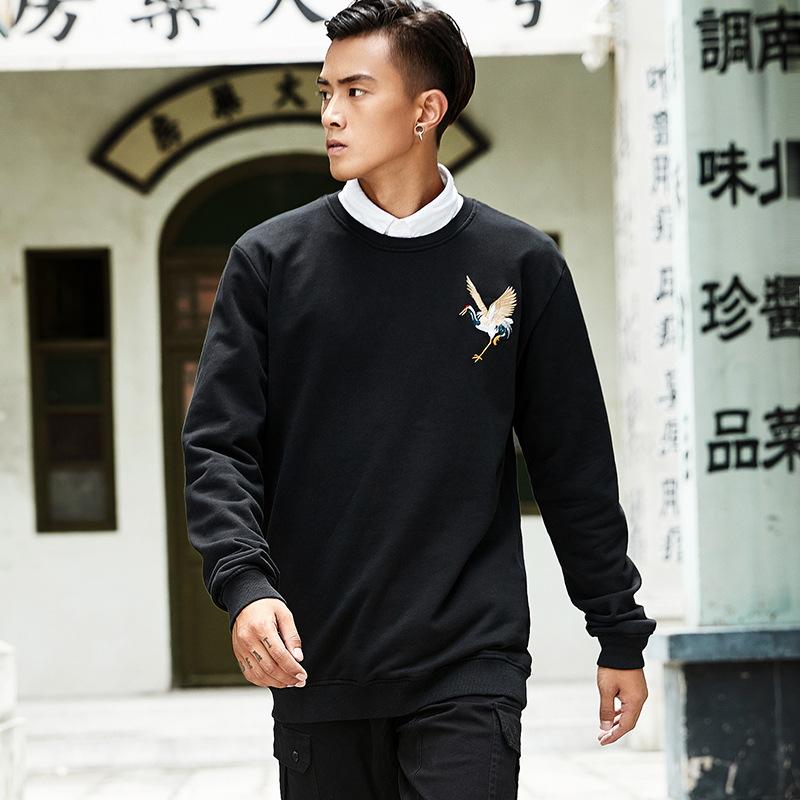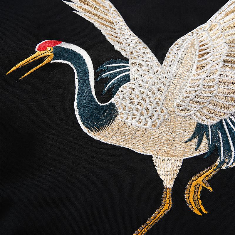 This sweatshirt features a giant crane, drawn in the traditional Japanese style. The crane appears to be preparing to fly, with its wings are spread out and its feet set to leap. The embroidered crane is vivid and full of vitality.