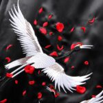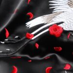The white embroidered pair of cranes stand out perfectly vivid and elegant from the black background. Cranes denote fortune and longevity. The red petals enrich the color and intensity the feeling of fortune and happiness.