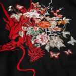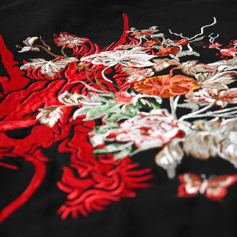 Drowning in flowers is soothing and relaxing. The embroidery of the dragon in flowers disseminates a harmonious and peaceful atmosphere. Even a vicious roaring dragon looks kind and accommodating in a sea of flowers and the feeble butterflies are flying around without alerts.