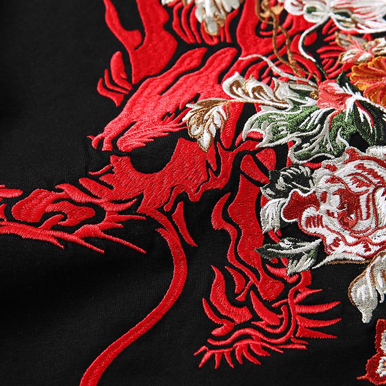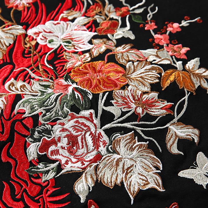 Drowning in flowers is soothing and relaxing. The embroidery of the dragon in flowers disseminates a harmonious and peaceful atmosphere. Even a vicious roaring dragon looks kind and accommodating in a sea of flowers and the feeble butterflies are flying around without alerts.