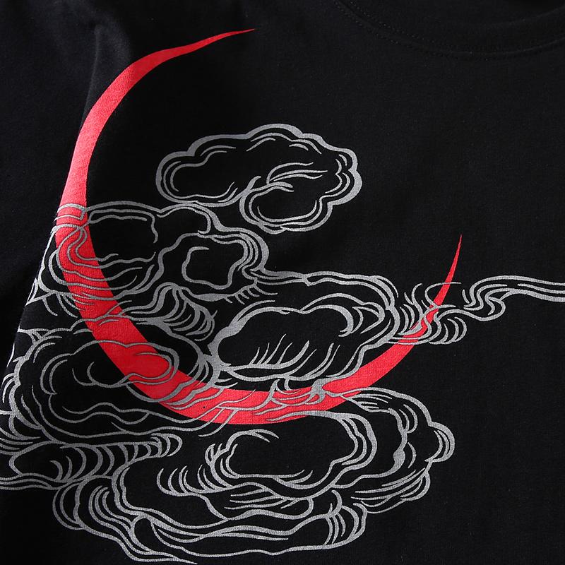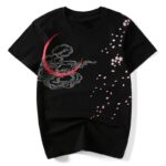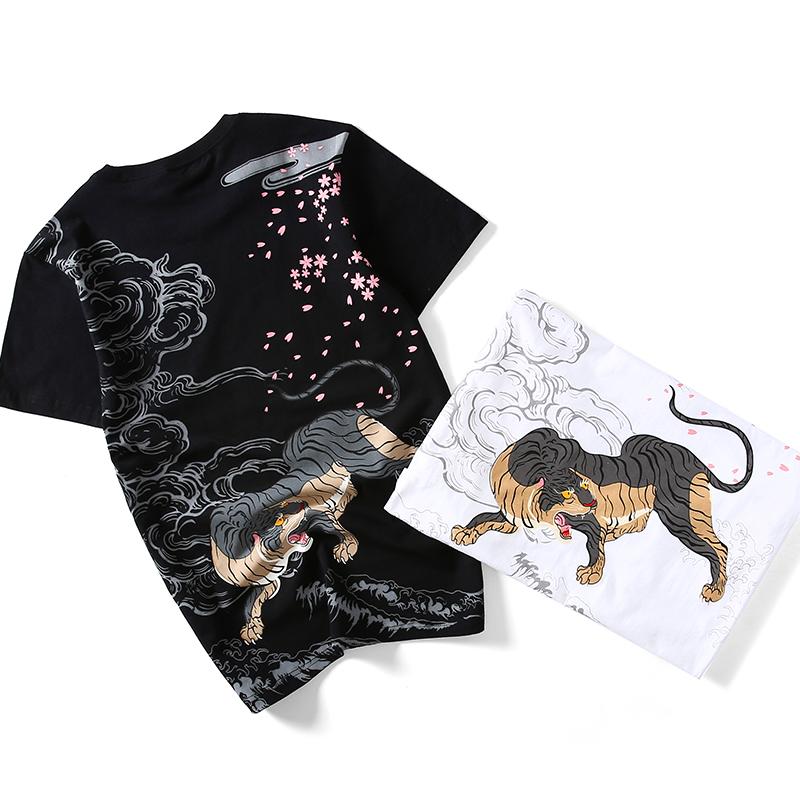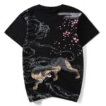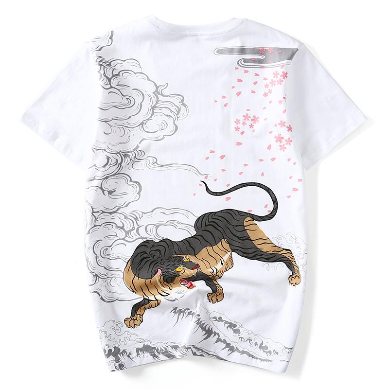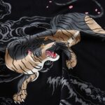 This particular shirt features a black and white tiger snarling at falling pink petals to ward off evil spirits. Like many traditional Japanese prints, it also features waves and clouds to create a strong impression on the viewer.