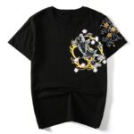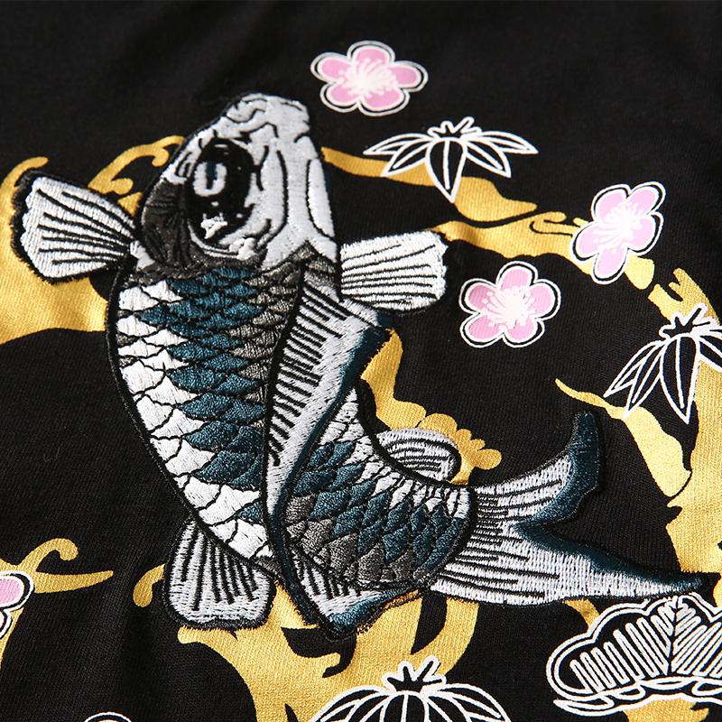This simple black shirt features a blue carp and a floral background. The carp is a popular symbol of strength and determination in traditional Japanese art, and this shirt captures that ancient artistic style very well.