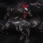 The Kirin in Japanese (Qilin) is a mythical hooved chimerical creature known in Chinese and other East Asian cultures, said to appear with the imminent arrival or passing of a sage or illustrious ruler. It is often depicted with what looks like fire all over its body. Look at the details of the embroidered, you will be amazed.