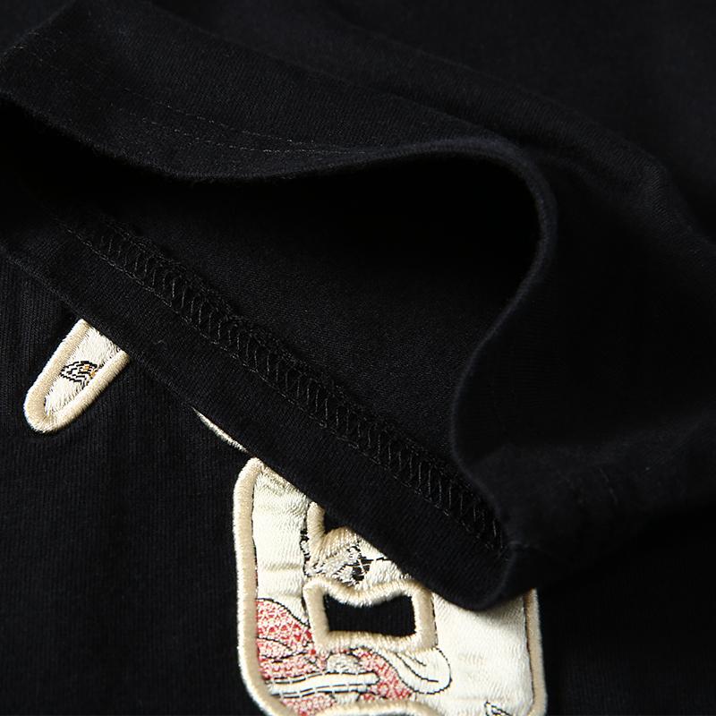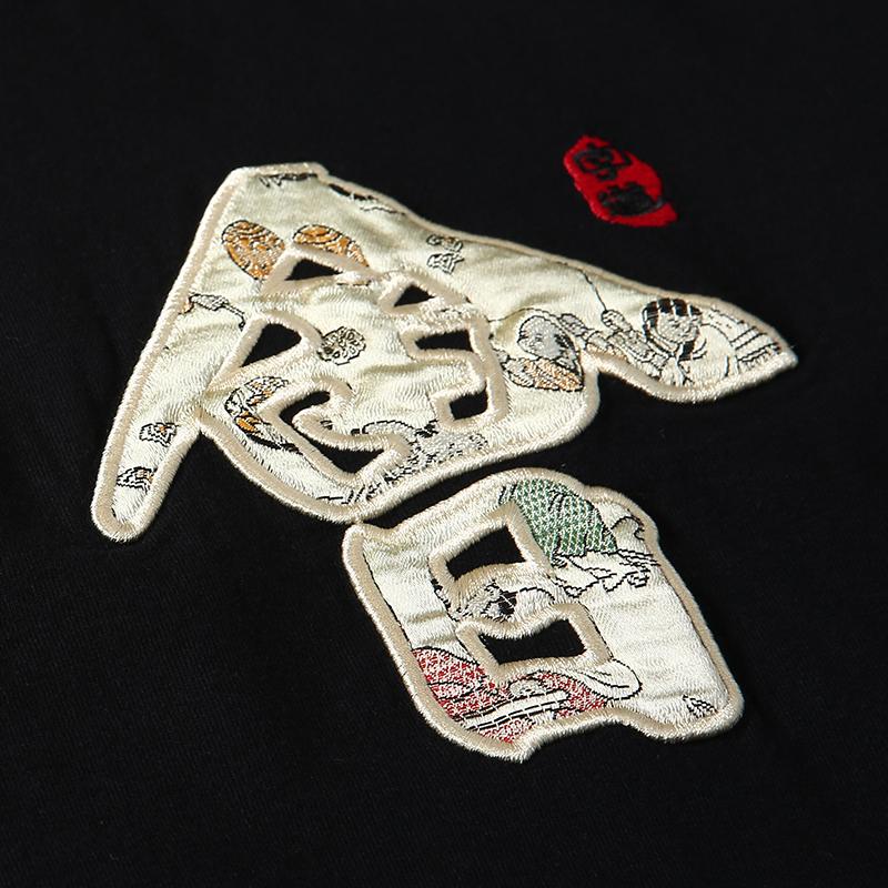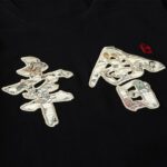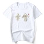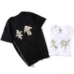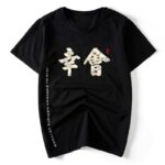 This shirt features several Japanese characters. The large characters on the center torso of the shirt with several images inside them are elegantly written and designed. They carry a polite meaning of nice to meet you.