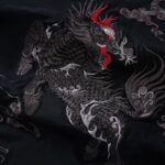 The Kirin in Japanese (Qilin) is a mythical hooved chimerical creature known in Chinese and other East Asian cultures, said to appear with the imminent arrival or passing of a sage or illustrious ruler. It is often depicted with what looks like fire all over its body. Look at the details of the embroidered, you will be amazed.